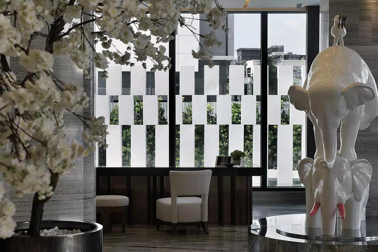 在大廳中,有兩只大象和叼著一片綠葉的鳥(niǎo)兒,象征著諾亞方舟尋找綠意的希望,這是和藝術(shù)家鄒駿升Page Tsou合作為旅人主題呈現(xiàn)一份心意